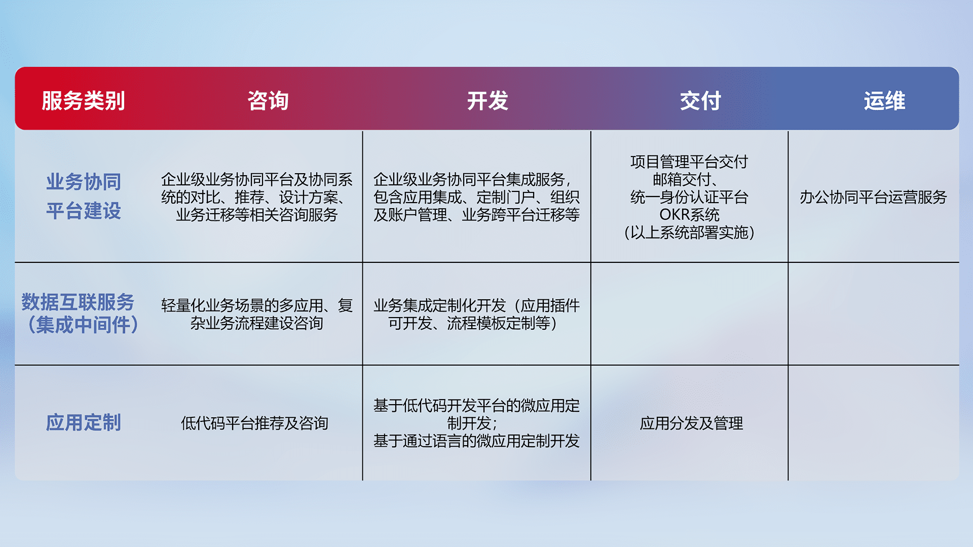 针对钉钉、、、企微、、、IDaas等平台级产品提供产品的规划、、、方案、、、交付、、、、定制化开发等服务,,,,实现如统一协同办公、、、智能客户服务、、混合会议管理、、智能数据查询、、、等业务场景,,实现数字化转型。。