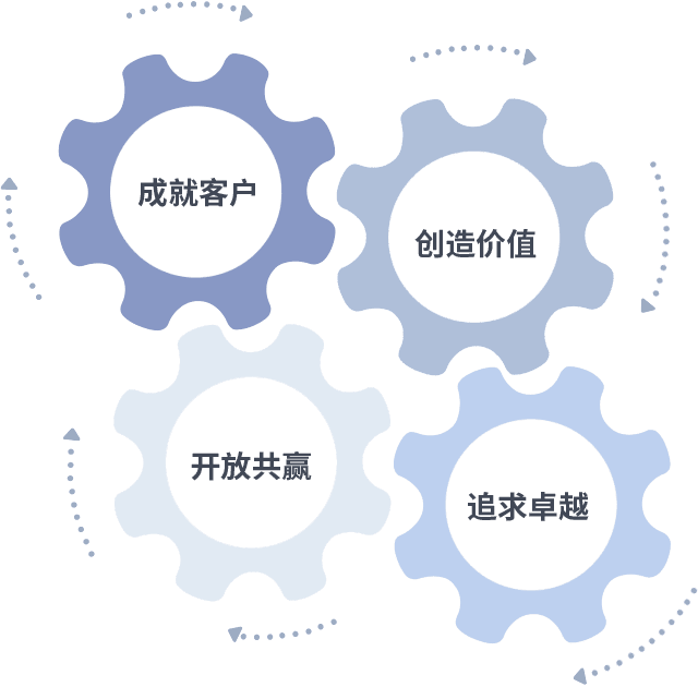 成就客户是一切决策的出发点,,,创造价值是衡量所有工作的标准,,追求卓越是我们做事做人的态度,,开放共赢是我们的格局也是最终的结果。。。价值观的齿轮环环相扣,,,推动着组织里的每个人不断向前。。。。